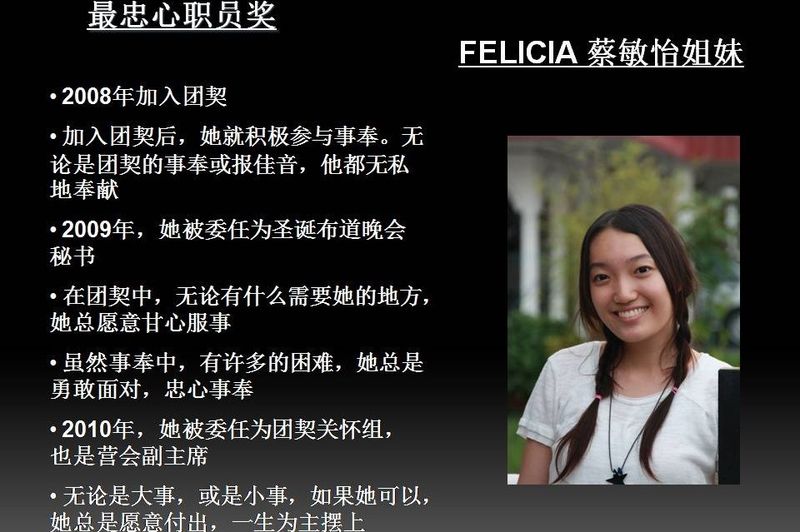 - 因着她和职员们的努力,2009年,团契人数终于突破二十,团契得以茁壮成长