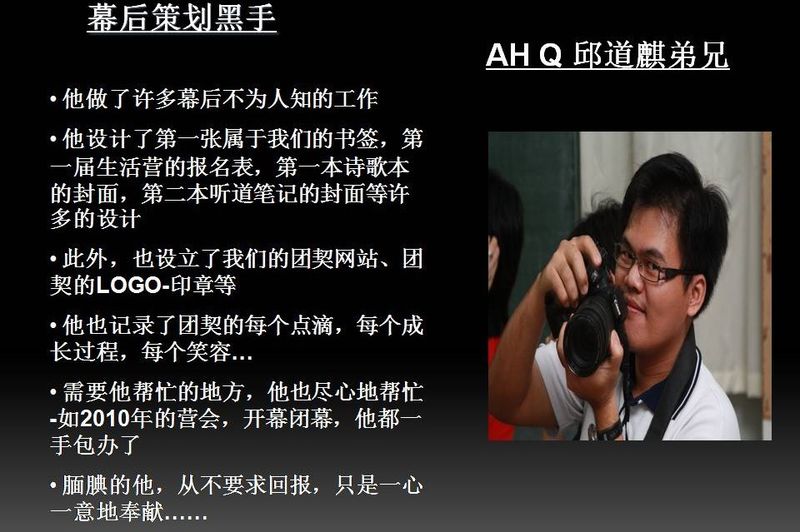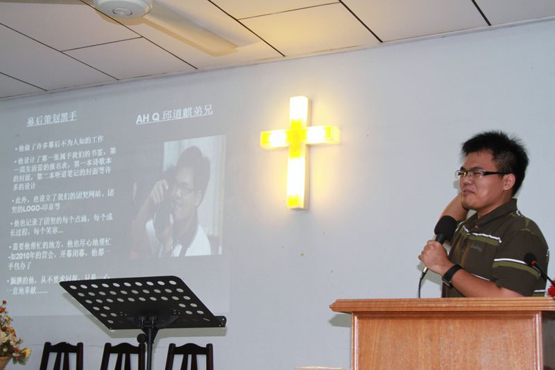 - 需要他帮忙的地方,他也尽心地帮忙-如2010年的营会,开幕闭幕,他都一手包办了